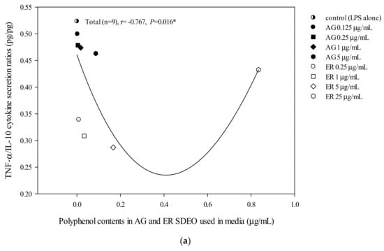 The correlation between total polyphenol (a), flavonoid (b) and saponin (c) contents in AG and ER SDEO used in the media and TNF-α/IL-10 cytokine secretion ratios using mouse macrophages in the absence of LPS. The correlation was expressed using the Spearman correlation coefficient. The correlation is considered statistically different if p < 0.05. **, p < 0.01.