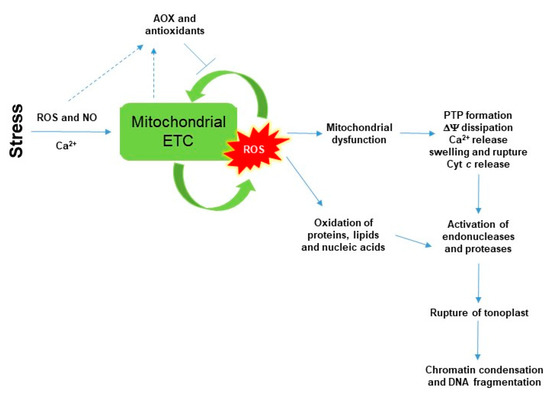 A schematic model for the role of mitochondria and mitochondrial reactive oxygen species (ROS) in programmed cell death (PCD) in plants. Briefly, stress-induced ROS and nitric oxide (NO) production, as well as Ca2+ inhibit the mitochondrial electron transport chain (ETC). This mitochondrial dysfunction increased mitochondrial ROS production in a self-amplifying manner leading the formation of permeability transition pore (PTP), dissipation of membrane potential (ΔΨ), loss of outer membrane integrity and release of cytochrome c (Cyt c) from the cytosol. Alternative components of plant mitochondrial ETC (e.g., alternative oxidase, AOX) and various mitochondrial antioxidants can attenuate mitochondrial ROS generation. However, several endonucleases and proteases are activated upon toxic ROS levels to degrade other cellular components such as vacuole membrane tonoplast and nuclei. Detailed description and references are in the text.