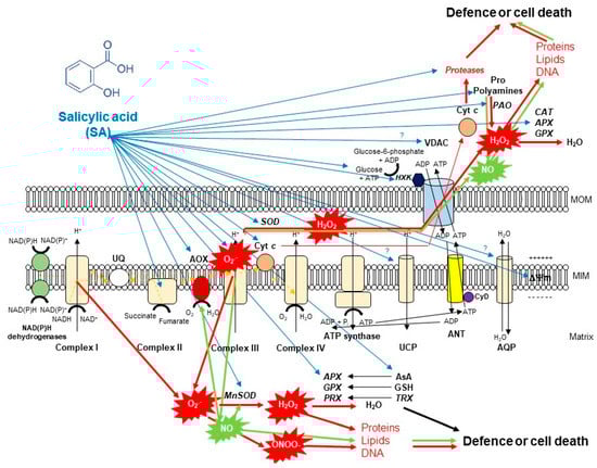 First of all, one of the most important is the analysis of the effects of SA on Mn-SOD (Figure 2). Mn-SOD is localized to mitochondria and peroxisomes and catalyzes the conversion of O2•− generated by the inhibition of ETC to H2O2 [138]. It was measured that the activity of Mn-SOD declined in response to different P. syringae pathovars after 24 h similarly to the expression of AOX1a triggering HR by mitochondrial O2•− in infected tobacco leaves [130]. In contrast to this observation, exogenous 1 mM SA treatment significantly elevated on gene-level the expression of chloroplastic Cu/Zn-SOD and mitochondrial Mn-SOD after 12 and 24 h in leaves of tomato plants [86].