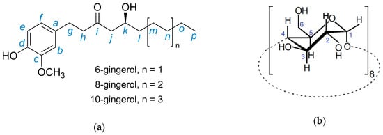 Schematic representation of (a) 6-, 8-, and 10-gingerols, the components of the mixture used as guest in this work, and (b) the host, γ-CD, depicting the herein adopted atom labeling scheme.