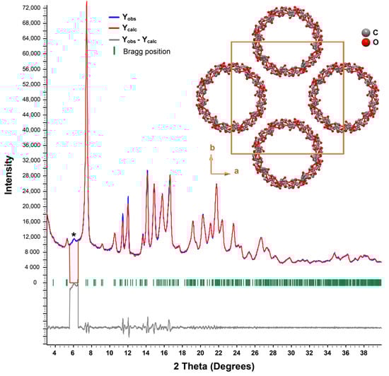 The collected powder X-ray diffraction pattern was indexed while using the LSI-Index algorithm that was implemented in TOPAS-Academic V5 [], and a whole-powder-pattern Pawley fit permitted to unequivocally confirm one again the cubic P4212 space group as the most suitable. A modified Thompson-Cox-Hastings pseudo-Voigt (TCHZ) profile function was selected to generate the line shapes of the simulated diffraction peaks []. A Pawley refinement of the collected PXRD led to refined tetragonal unit cell parameters of a = b = 23.885(4) Å, c = 23.351(4) Å, α = β = γ = 90°, ultimately confirming the formation a new inclusion compound (Figure 3) []. Although no contamination of pure γ-CD heptahydrate is presented, one notes the existence of a small reflection at low angles attributable to an unidentified (poorly) crystalline phase (asterisk in Figure 3). The unit cell parameters determined for γ-CD∙gingerols are, thus, characteristic of γ-CD inclusion compounds. So far, all known structures with this host are isotypical, crystallising in tetragonal space group P4212. The packing arrangement has a high symmetry, with all of the γ-CD∙guest units being stacked in the form of infinite channels, as depicted in the inset of Figure 3. The longitudinal axes of the channels (parallel to the [001] direction of the unit cell) are aligned to form squares, a geometry that results in the formation of wide inter-channel void spaces that are able to retain a large amount of water molecules (not shown in Figure 3 for clarity). Thus, it is fair to assume that the same geometry occurs in γ-CD∙gingerols, and that it accounts for the increase in hydration waters that was observed in elemental analysis.