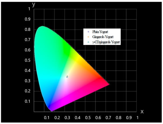 The colour of yogurt fortified with gingerols and γ-CD·gingerols, as well as plain yogurt (used as reference), was assessed by the colour parameters L*, a* and b*, as measured by reflectance spectrophotometry. The difference in colour is expressed as the associated error or ΔE between the reference sample, i.e., plain yogurt, and the innovative samples (refer to the Experimental section for details on the calculation). The ΔE of the yogurt that was fortified with gingerols was 2.84, while that of yogurt with γ-CD·gingerols was ΔE = 1.94. According to the definition of CIE (Commission internationale de l′éclairage), no differences are noticed when ΔE > 1 and, for 1 > ΔE > 2, only an experienced observer can notice the difference. Based on that, the gathered results indicate that the change of colour of the yogurt that was fortified with γ-CD·gingerols was very subtle, when compared to that of plain yogurt, and that it would be undetected by the average consumer. In turn, any observer would detect changes in the colour of yogurt with the pure gingerols (ΔE > 2). However, it should be mentioned that, even in that case, the difference is not salient, and the colour of gingerol yogurt can be described as a pale beige tone (resembling ‘latte macchiato’). For better visualization, the L*, a*, b* parameters of the three yogurt batches were converted to (x,y) coordinates and graphically represented in a CIE 1931 chromaticity diagram, as depicted in Figure 5.