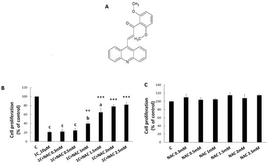 HCT116 cell proliferation treated with chalcone 1C ((2 E)-3-(acridin-9-yl)-1-(2,6-dimethoxyphenyl)prop-2-en-1-one) alone (A) or in combination (N-acetyl cysteine (NAC)/1C) (B) and after NAC dilutions (C). Data were obtained from three independent measurements. Significantly different a p < 0.05, b p < 0.01, c p < 0.001 vs. untreated cells (control); ** p < 0.01, *** p < 0.001 vs. 1C.
