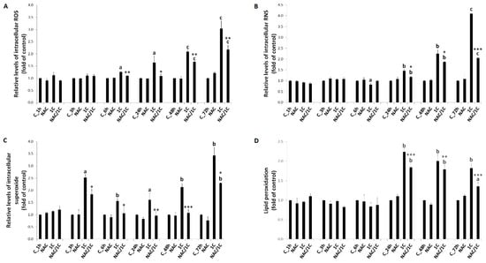 Firstly, we detected increased levels of ROS after 24, 48, and 72 h of treatment. Moreover, using specific indicators, we also detected higher concentrations of superoxide and nitric oxide (NO). It has been demonstrated that reaction of NO and superoxide resulted in production of peroxynitrite, a highly reactive oxidant that is probably responsible for cytotoxicity both of these oxidants [,]. Interaction of peroxynitrite with membrane polyunsaturated fatty acids often results in lipid peroxidation []. In line with this evidence, we also detected significant increase of lipid peroxides in 1C-treated cells.
