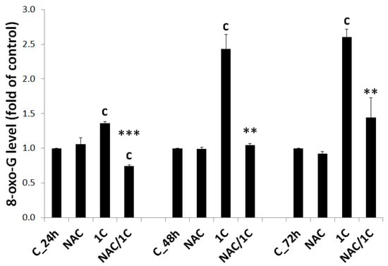 Oxidative DNA damage detection using 8-oxo-7,8-dihydroguanine (8-oxoG) level measurement after 24, 48, and 72 h incubation of HCT116 cells with 1C and NAC/1C. Significantly different c p < 0.001 vs. untreated cells (control); ** p < 0.01, *** p < 0.001 vs. 1C.