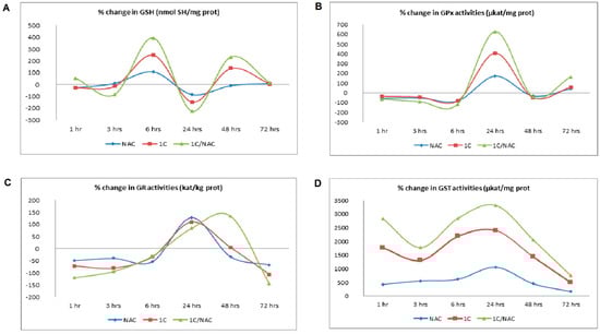 Furthermore, because oxidative stress is the result of pro-oxidants/antioxidants disbalance, we also studied effect of 1C on endogenous antioxidant status. Reduced glutathione and GSH-related enzymes play an important role in protection against reactive species produced during oxidative stress. As presented in Figure 4A and Table S1, the content of GSH in 1C-treated cells was biphasic, with the highest level after 6 and 48 h of treatment. In addition, decrease in GSH content was detected after 24 h of incubation. Activity of GSH-related enzyme was time-dependent. Treatment of HCT116 cells with 1C resulted in increased activity of GPx and GR after 24 h of incubation only. On the other hand, activity of GST was increased during the whole course (Figure 4B–D; Table S1). NAC modulated GSH content as well as activity of GSH-related enzymes. The content of GSH in 1C/NAC-treated cells was increased after 6 and 48 h of treatment and decreased after 24 h of treatment. This biphasic response was also observed in 1C-only-treated cells, however, combination with NAC increased content of GSH in a more appreciable manner. Moreover, NAC increased activity of GPx, GR, and GST when compared to 1C-treated cells.