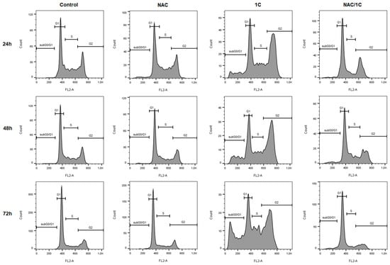 Cell cycle analysis of HCT116 cells after 24, 48 and 72 h incubation with NAC, 1C, or NAC/1C.