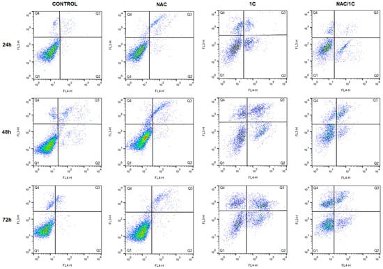 To explain the association between oxidative stress and 1C-induced cell death, double annexin V/PI (propidium iodide) staining was used, and measurements were conducted after incubation of HCT116 cells with 1C, NAC, or both. As depicted in Figure 6 and Table 4, 1C significantly reduced the percentage of living cells after 24 h of incubation, and this effect was noticed also after 48 and 72 h incubation (p < 0.001). Furthermore, the increase in the population of apoptotic and dead cells was also observed. However, compared with that in groups treated with 1C alone, the number of living cells significantly increased with the concomitant decrease of apoptotic and dead cells after co-treatment with NAC (p < 0.05, p < 0.01, and p < 0.001).