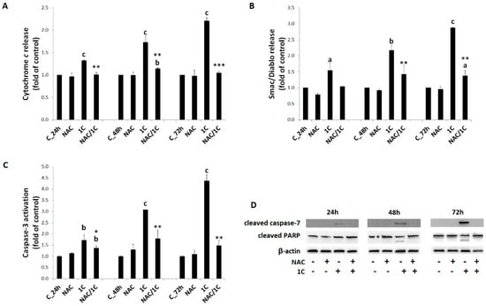 Mitochondrial apoptotic pathway alteration in 1C-treated and NAC/1C-co-treated HCT116 cells represented by cytochrome c release (A), expression of Smac/DIABLO (B), and caspase-3 (C) or caspase-7 activation and PARP cleavage (D). Significantly different a p < 0.05, b p < 0.01, c p < 0.001 vs. untreated cells (control); * p < 0.05, ** p < 0.01, *** p < 0.001 vs. 1C.
