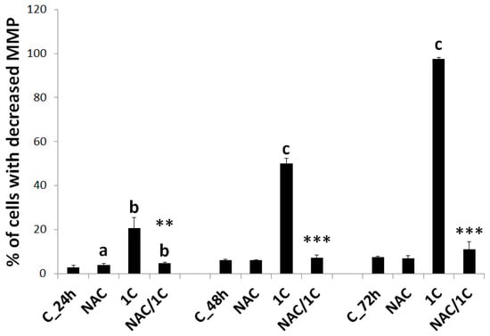 Mitochondrial membrane potential changes after 1C or NAC/1C treatment. Significantly different b p < 0.01, c p < 0.001 vs. untreated cells (control); ** p < 0.01, *** p < 0.001 vs. 1C.