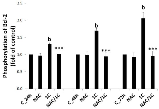 The function of anti-apoptotic Bcl-2 protein depends on phosphorylation status, and Bcl-2 phosphorylation suppresses its anti-apoptotic activity. Treatment of HCT116 cells with 1C led to a significant increase in phosphorylation of Bcl-2, thus enabling the initiation of intrinsic apoptotic cascade. In contrast to 1C, addition of NAC completely abolished Bcl-2 phosphorylation, thus preventing further apoptotic events (p < 0.001 vs. 1C alone) (Figure 9).