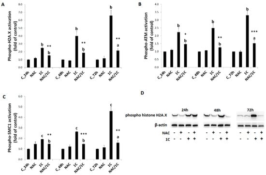 Analysis of DNA damage-related proteins. Phospho histone H2A.X (A,D), phospho-ataxia telangiectasia mutated kinase (ATM), (B) and phospho-structural maintenance of chromosomes 1 (SMC1) (C) levels after 24, 48, and 72 h of 1C or NAC/1C treatment. Significantly different a p < 0.05, b p < 0.01, c p < 0.001 vs. untreated cells (control); * p < 0.05, ** p < 0.01, *** p < 0.001 vs. 1C.