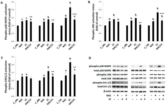 Phosphorylation status of mitogen-activated protein kinase (MAPK) proteins. Phosphorylation changes of p38 MAPK (A,D), JNK (B,D), and ERK1/2 (C,D) as the result of 1C or NAC/1C combination treatment. Significantly different a p < 0.05, b p < 0.01, c p < 0.001 vs. untreated cells (control); ** p < 0.01, *** p < 0.001 vs. 1C.