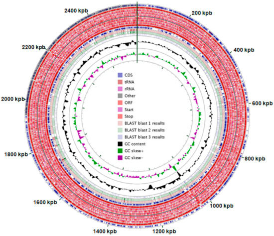 Genes were identified using the RAST v.2.0 and KAAS v.2.2 (parameters for bacterial genome) tools—Predicted genes were translated and functionally described [14,15,16]. Metabolic pathway prediction (KEGG pathway mapping - Kyoto Encyclopedia of Genes and Genomes) was performed with RAST v.2.0 tool [14,15,16] and KAAS v.2.2 (BlastKoala) to assign KEGG Orthology (KO) numbers to each predicted CDS. Clusters of Orthologous Groups of Proteins (COGs) were determined using eggNOG v.4.5.1 [17]. Ribosomal RNA genes were detected using RNAmer v.1.2 [18] and tRNA genes were identified using tRNAscan-SE v.2.0 [19]. Genome mapping (visualization of the genome properties) was performed using CGView software v.1.0 [20]. Transmembrane helices and signal peptides were found with TMHMM v.2.0 [21] and SignalP v.5.0 [22], respectively. CRISPR loci (Clustered Regularly Interspaced Short Palindromic Repeats) were searched for using the CRISPRFinder server. Antibiotic resistance genes were predicted using Comprehensive Antibiotic Resistance Database (CARD). Furthermore, a comparison of nucleotide sequences was performed using the BLAST tool. Unless otherwise mentioned, default parameters were used.