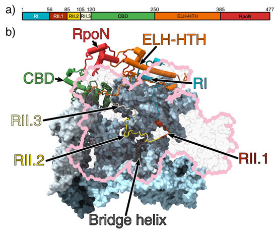 σ54 is made up of three regions based on sequence conservation (referred to as RI-III) and four structural domains, which bind to RNAP to form the holoenzyme and interact with DNA (Figure 1a). Structures of the holoenzyme, the DNA bound closed complex (RPc) and the activator bound intermediate complex (RPi) reveal that Region I (RI) consists of two α-helices and, consistent with earlier biochemical data, is responsible for interaction with the bEBP and DNA at the −12 region. Region III (RIII) consists of an RNAP core-binding domain (CBD), an extra-long α-helix followed by a helix-turn-helix (ELH-HTH) domain and an RpoN box domain (Figure 1a) [15,17,18]. RIII binds to the −12 and −24 promoter regions via the ELH-HTH domain and RpoN box domain respectively. RI interacts with RIII ELH-HTH to form a structural domain that binds to the β and β’ cleft [6,19] (Figure 1b).