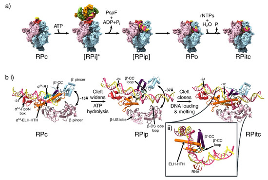 The cryo-electron microscopy (cryoEM) structures of the transcription closed (RPc), intermediate (RPi), partially loaded (RPip), open (RPo) and initially transcribing complexes (RPitc) have captured snapshots of the conformational changes during σ54 mediated and bEBP dependent transcription initiation (Figure 4a,b), explaining at multiple levels why the closed complex is unable to spontaneously proceed to an open complex and how bEBPs activate transcription by overcoming the strong transcription inhibition imposed by σ54.