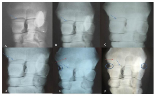 Figure 1. Showing radiographic grading: (A) normal (Day 0), (B) after one month of induction, (C) after 2 months, (D)after 3 months, (E)after 5 months, (F) After 7 months. The radio-carpal joint space showed gradual narrowing (blue arrows), subchondral bone sclerosis (red arrows) and osteophyte appeared in late stages (circle).