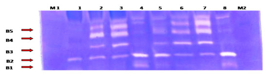 Figure 3. Heparin-enhanced gelatin zymography for MMP activity detection from the synovial fluid samples. Lane 1: represents day 0 (control) samples; lane 2: first week samples; lane 3: first month samples; lane 4: second month samples; lane5: third month samples; lanes 6 and 7: fifth month samples; and lane 8: seventh month samples. B1: corresponding to active MMP13 (48 KDa); B2: active MMP-1(57 KDa); B3: active MMP-2 (66 kDa); B4: active MMP-9 (86 KDa); and B5: latent MMP-9 (92 KDa). M1: pre-stained protein marker (10–175 KDa) (M1 was loaded at the beginning of the electrophoresis, while M2 was loaded 20min after the electrophoresis began).