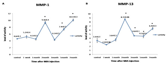 Figure 4. Graphical representation of the changes in the activity of matrix metalloproteinases (MMPs) during the disease progression post-monoiodoacetate (MIA) injection at day 0, 1st week, 1st month, 2nd month, 3rd month, 5th month, and 7th month. (A) Representing the activity of MMP-1. (B) Representing the activity of MMP-13. All data are represented as (mean ± SEM) for triplicate samples (n = 3). * denotes a significant difference from control samples at day 0 at p < 0.05.