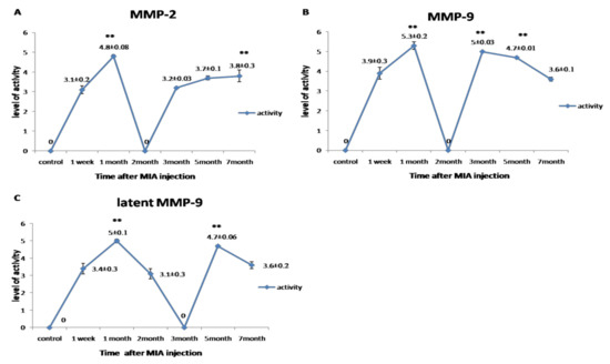 Figure 5. Graphical representation for the changes in the activity of MMPs during the disease progression post-MIA injection at day 0, 1st week, 1st month, 2nd month, 3rd month, 5th month, and 7th month. (A) Representing the activity of MMP-2. (B) Representing the activity of MMP-9. (C) Representing the activity of latent MMP-9. All data are represented as mean ± SEM for triplicate samples (n = 3). ** denotes significant difference from samples in the 1st week at p < 0.05.