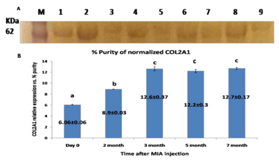 Figure 6. (A) Western blot membrane representing the specific band for COL2A1 protein from the synovial fluid; located at MWT, about 65 KDa. (M): pre-stained protein marker; lanes 1, 2 representing samples at day 0 (control); lanes 3, 4 representing samples for the 2nd month; lane 5: samples at the 3rd month; lanes 6 and 7 samples at the 5th month; and lanes 8 and 9 corresponding to the 7th month. (B) Graphical representation for the level of COL2A1 protein expression level relative to total protein Coomassie blue staining) as quantified by densitometric analysis of the bands. Data presented as the mean ± SEM for triplicate samples (n = 3). Values with the same letters are non-significantly different (p > 0.05) while the values of different letters are significantly different (p < 0.05).