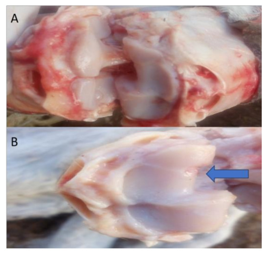 Figure 7. Representative images of the macroscopic observation for the distal articular surface of the radius. (A) Represents the right radiocarpal joint, while (B) Represents the left radiocarpal joint, showing erosions at the distal articular surface of the radius after the 7th month (blue arrow).