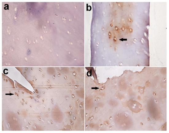 Figure 10. Immunohistochemical staining of Caspase-3 in articular cartilage, equine. (a) Caspase-3 negative chondrocytes in control group; (b) few Caspase-3 positive chondrocytes in the MIA-injected group after 3 months (arrow); (c) many Caspase-3 positive chondrocytes in the MIA-injected group after 5 months; (d) and in MIA-injected group after 7 months (arrow). Immuno-peroxidase stain X 400.