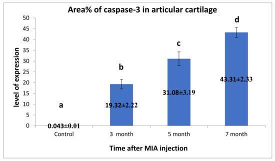 Figure 11. Immunohistochemical analysis for area% of Caspase-3 in examined articular cartilage revealed increased expression of Caspase-3 in chondrocytes compared to control. The expression of Caspase-3 increased with the increase of time post-MIA injection. Data presented as the mean ± SEM for triplicate samples (n = 3). Values with the same letters are non-significantly different (p > 0.05), while the values of different letters are significantly different (p < 0.05).