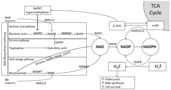 The association between IDH1/2 mutation and NAD Production in Cancer. Mutant IDH1/2 converts α-ketoglutarate (α-KG) into D-2 hydroxyglutarate (D-2HG), an oncometabolite that causes hypermethylation at CpG islands of NAPRT promoter region, results in nicotinic acid pathway inhibition. Cancer cells maintain the adequate level of NAD pool through NAD salvage pathway and NADPH generation. NADPH is used as a substrate to generate D-2HG to promote oncogenesis. One of the possible mechanisms for cancer cell survival is achieved through catalytic activity of dihydrofolate reductase (DHFR) that maintains folate pool and induces DNA synthesis. TCA: tricarboxylic acid; NAPRT: nicotinate phosphoribosyltransferase; NAMN: nicotinic acid mononucleotide; NAAD: nicotinic acid adenine dinucleotide; NADS: NAD synthase; QAPRT: quinolinate phosphoribosyltransferase; NMN: nicotinamide mononucleotide; NAR: nicotinic acid riboside; NR: nicotinamide riboside; NRK1/2: nicotinamide riboside kinase 1/2; H2F: dihydrofolate; H4F: tetrahydrofolate.