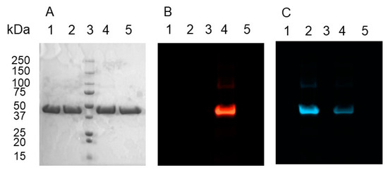 SDS PAGE gel of protein conjugates obtained after first reacting 10 µM 15 with 10 µM MBP-dC10*, followed by the conjugation of rhodamine B azide (RhB-N3) to MBP-dC10* through 15 using CuAAC. (A) Coomassie stained gel showing MBP-dC10* bands. (B) Unstained gel imaged using a 605/50 filter. (C) Unstained gel excited with Blue Epi Illumination and imaged with a 530/28 filter. Lanes: (1) MBP-dC10* (2) MBP-dC10* reacted with 15 (3) pre-stained protein molecular weight markers (4) MBP-dC10* reacted with 15 and then conjugated to RhB-N3 (5) MBP-dC10* incubated with RhB-N3 under CuAAC conditions.