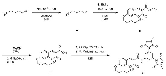 In this approach, we attached the hexyne group before attaching the dimaleimide quenching intermediate 5 (Scheme 3). Thus, 7 was first synthesized from 6-chlorohexyne before using 2 to displace the iodide in 7, obtaining 8 in decent yield. As performed in the synthesis of 1, ester 8 was then hydrolyzed to provide 9 in excellent yield, which was then converted to the acid chloride using SOCl2. The acid chloride was then reacted with aniline 5 in pyridine to attach the quenching dimaleimide moiety and form 6. This coupling of aniline 5 also gave a low yield, although slightly better than the HBTU-mediated reaction (Scheme 2).
