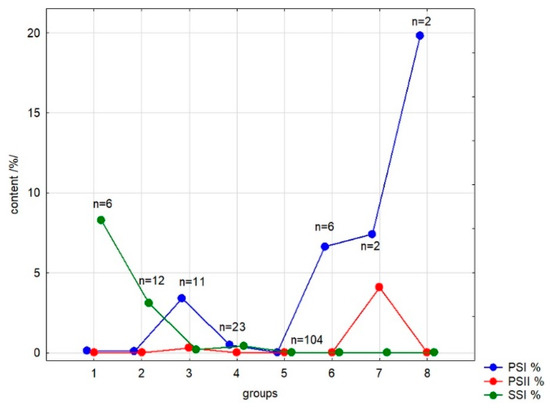 K-means clustering led to the separation of a dataset into eight groups of different numbers (Figure 2). The most numerous group 5 consists of samples containing no one of analyzed compounds at a concentration higher than 0.2%; the second numerous group 4 contains samples with poor concentrations of all three saponins. Group 2 collects the samples with medium amounts of the sakurasosaponin (mainly from subgenus Auganthus—section Cortusoides and subgenus Auriculastrum—sections Cuneifolia and Dodecatheon) while samples containing large amounts of this compound are gathered in group 1 (exemplars from subgenera AuganthusP. forrestii, P. obconica, P. takedana—and AuriculastrumP. angustifolia, P. clevelandii and P. tetrandra). Group 3 consists of samples with an medium content of primulasaponin I, groups 6 and 7—high content of this compound (in case of group 7, accompanied by significant amounts of primulasaponin II). Samples very rich in single primulasaponin I from subgenus Primula, section Sredinskya are in group 8. Ascriptions of samples to groups 1–3 and 6–8 are presented in Table 3.