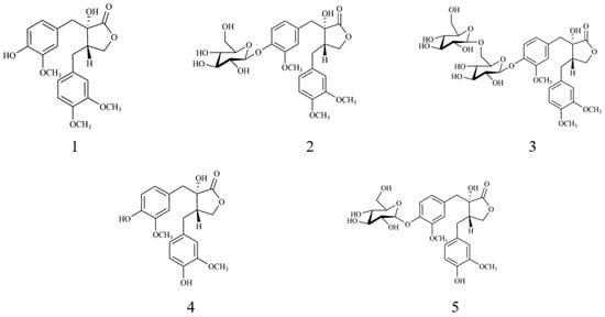 The five lignans were identified as trachelogenin (1) [13], tracheloside (2) [14], trachelogenin β-gentionbioside (3) [15], nortrachelogenin (4) [16] and nortracheloside (5) [17] by comparing them with previously reported spectroscopic data. Nodes from compounds 1–5 were easily displayed in the molecular networking and HCA results (Figure 4). Notably, in the MN, nodes 2 (m/z 387.14 [M−H]−), 1 (m/z 595.20 [M+Glc+2Na]−) and 28 (m/z 711.24 [M+2Glc]−) for compounds 1–3, which have the same backbone except for the sequential attachment of glucose moieties, were not present in one cluster but they were closely located in the HCA results (Figure 4).