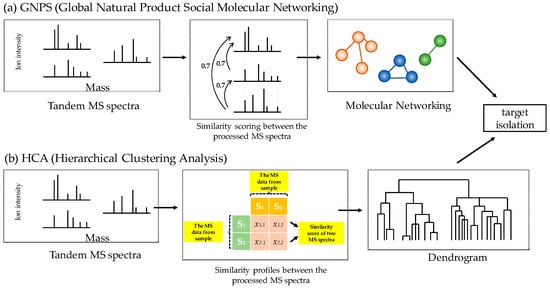 In the present study, we compared the HCA results between the structural similarities of the processed MS spectral data derived from single compounds with the molecular networking results obtained through GNPS (Figure 2). The molecular networking results showed connections between two nodes with similar spectral patterns (cosine similarity threshold >0.7). The molecular type of the cluster was identified by comparison with MS databases [8]. We attempted to selectively isolate specific types of compounds using the information on the nodes annotated by the MN. Although these nodes were derived from the same backbone, the different strong fragmented ions lowered the similarity score and hindered the connection between them. We applied HCA to improve the results of molecular networking. The matrix profile generated using similarity scores provided clear evidence on the nodes that were absent in the MN and the results were presented as a dendrogram [9]. The nodes with similar score profiles were more closely located in the smaller clusters.