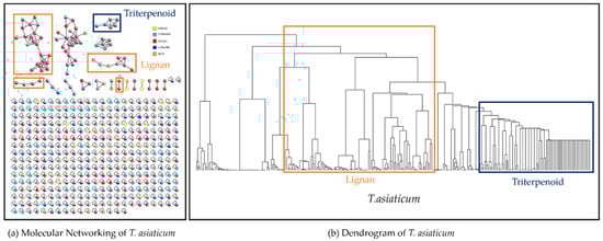 We constructed an MN of total methanolic extract fraction and sub-fractions (n-hexane, EtOAc, n-BuOH and H2O) from T. asiaticum using the GNPS platform. In our study, some clusters in the MN included nodes annotated as lignans and triterpenoids, but many other nodes that were not connected in the cluster were not annotated. To overcome the general limitation of GNPS, we used the similarity score profiles of the MS spectral data of every single node against the similarity score profiles corresponding to all of the nodes. The nodes that had more similar backbones were closely located together in the lower branches. Using this proof of concept, we could identify the nodes for lignans and triterpenoids in the dendrogram. Some nodes that were not grouped in the MN were located in the lower branches of the dendrogram and were successfully utilized for the targeted isolation of five dibenzylbutylrolactone-type lignans (1–5). Thus, the combination of molecular networking and HCA improved the experimental efficiency of the targeted isolation of compounds possessing cytotoxic activities against four cancer cell lines. In the next study, we will try to automatically compare the MN and HCA results for the simple and rapid annotation of nodes.