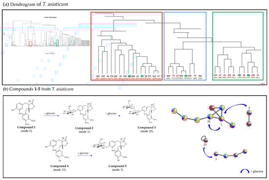 Compound 5 had an additional glucose unit compared to compound 4; however, compounds 4 (node 15) and 5 (node 3) were not clustered in the same sub-group in the MN. Contrastingly, nodes 3 and 15 in the HCA results were closely located together in the low-level cluster. It was confirmed that node 114 possesses an additional glucose compared to compound 5 and was identified as nortrachelogenin 4,4′-di-O-β-d-glucopyranoside [18,19]. Node 114, which was not clustered in GNPS, was found near compounds 4 and 5 in the HCA (See Figure S8 in Supplementary Materials).