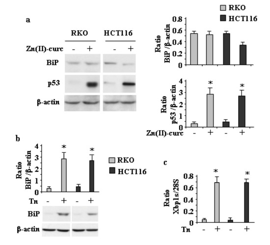 To further address the correlation between mutp53H273 degradation and ER stress activation, wtp53-expressing cells were treated with Zn (II)-curc. As shown in Figure 2a, Zn(II)-curc did not increase BiP expression levels or induce Xbp1 splicing (not shown) in wtp53-expressing cells, while it stabilized endogenous wtp53 protein levels in accordance with previous studies where zinc supplementation induced wtp53 oncosuppressor activities and the transcription of target genes such as p21, Puma, and Bax [14,36]. On the contrary, both BiP (Figure 2b) and Xbp1 splicing (Figure 2c) were efficiently induced in wtp53-expressing cells by Tunicamycin (Tn), a drug causing ER stress by inhibiting N-linked glycosylation [37]. Altogether, these results indicate that the IRE1α/XBP1 arm of UPR was activated in response to Zn (II)-curc only in mutp53H273 cells.