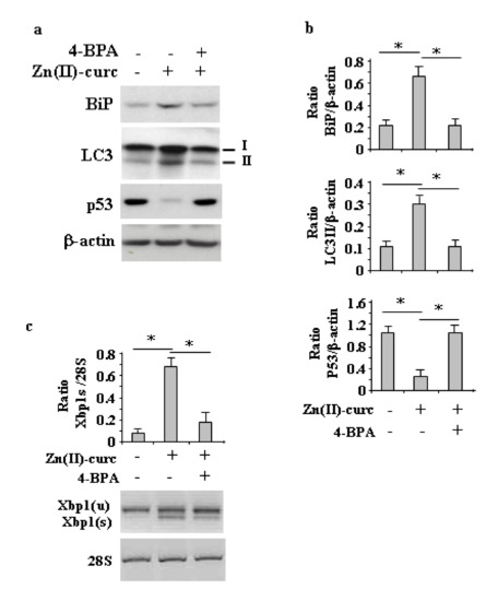 To evaluate the role of ER stress/UPR activation in Zn (II)-curc-induced autophagy, we analyzed the LC3I/II level (a cellular readout of autophagy) [18] by Western blot in U373 cells treated with Zn (II)-curc with or without pre-treatment with 4-Phenyl butyric acid (PBA), a molecular chaperone that dampens the ER stress [30]. The results show reduction of LC3II levels in the presence of 4-BPA, concomitantly to the reduction of Zn (II)-curc-induced BiP protein levels (Figure 3a,b) and Xbp1 splicing (Figure 3c), suggesting that a possible autophagy inhibition was occurring following ER stress inhibition, which is in agreement with the known role of Xbp1 splicing in triggering autophagy [38]. Concomitantly, we verified the effect of ER stress inhibition on mutp53 levels and found that mutp53 protein was no longer downregulated in the presence of 4-BPA (Figure 3a,b).