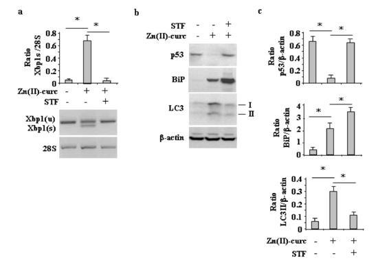 Similarly, the inhibition of IRE1α-Xbp1 by the small molecule STF [31,32], which indeed counteracted the Zn (II)-curc-induced Xbp1 splicing (Figure 4a) and slightly increased BiP levels (Figure 4b,c), impaired the Zn (II)-curc-induced increase of LC3II levels and counteracted the Zn (II)-curc-induced mutp53 downregulation (Figure 4b,c). Altogether, these results suggest that the Zn (II)-curc-induced IRE1α-Xbp1 arm of the UPR was able to promote autophagy and mutp53 downregulation.
