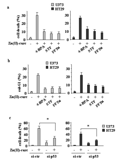Next, we evaluated the role of ER stress/IRE1α activation on Zn (II)-curc-induced cell death. To this aim, we combined Zn (II)-curc with either ER stress or IRE1α inhibitors. The results show that both 4-BPA and STF efficiently reduced the Zn (II)-curc-induced cell death (Figure 5a,b), suggesting that the activation of ER stress balanced the cell death/survival equilibrium towards cell death. Similarly, the inhibition of wtp53 transcriptional activity with PFT-α (Figure 5a,b), as well as p53 knockdown (Figure 5c), reduced the Zn (II)-curc-triggered cell death, in agreement with the effect of Zn(II)-curc on the reactivation of wtp53 oncosuppressor functions, as previously reported [12,14,15]. Altogether, these results suggest that both ER stress/UPR activation and wtp53 reactivation by Zn (II)-curc promoted cell death in mutp53 cells.