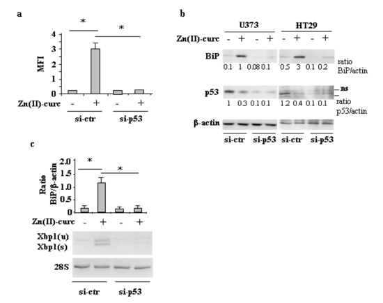 Finally, we asked whether Zn (II)-curc-induced mutp53 downregulation was upstream of the ER stress or rather the consequence of UPR/autophagy activation. To address this issue, p53 was knocked-down with siRNA, and ER stress was analyzed by several approaches. Analysis of ER by immunofluorescence shows that the increase in ER size by Zn (II)-curc was abrogated in the U373 cells undergoing p53 knockdown (Figure 6a); in agreement, the Zn (II)-curc-induced BiP protein levels (Figure 6b) and Xbp1 splicing (Figure 6c) were strongly reduced by p53 knockdown in both U373 and HT29 cells, suggesting that mutp53H273 degradation by Zn (II)-curc was likely upstream of the ER stress/UPR activation.