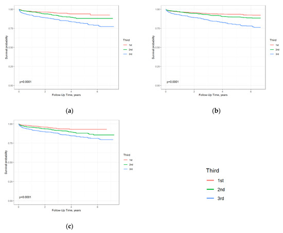 Figure 1. Survival curves for cardiovascular (CV) death and/or acute myocardial infarction (MI) according to tertiles of levels of hsTnI: (a) (1st tertile up to 5.20 ng/L; 2nd tertile up to 24.63 ng/L), NT-proBNP, (b) (1st tertile up to 132.74 pg/mL; 2nd tertile up to 418.14 pg/mL) and hsCRP, and (c) (1st tertile up to 2.04 mg/L; 2nd tertile up to 6.35 mg/L) in all. The p-values are for the logrank test.