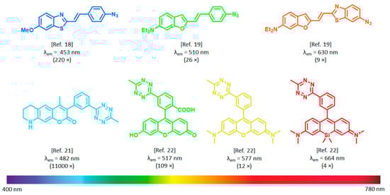 In terms of reaction kinetics, biocompatibility, synthetic accessibility, and compatibility with GCE, strain promoted azide–alkyne cycloaddition (SPAAC) of azides and strained alkynes [13] and the inverse electron demand Diels–Alder (IEDDA) reaction of tetrazines and strained alkenes/alkynes [14] are the most robust bioorthogonal reactions. Besides, as we and others have recently demonstrated, functional groups of the SPAAC and IEDDA reactions, i.e., the azide and the tetrazine moieties, are able to modulate (i.e., quench) fluorescence by various mechanisms (e.g., energy transfer [15,16,17], rotation-induced relaxation [18,19], or photoinduced electron transfer [20]). Upon transformation of the quenching bioorthogonal unit in a specific ligation reaction, the fluorescence reinstates (Scheme 1). This two-in-one combination of bioorthogonal handles was exploited in the design of coumarin [21], BODIPY [16], phenoxazine [17], rhodamine [22], and cyanine-based [23], bioorthogonally applicable fluorogenic probes. It was observed, however, that the fluorescence increase upon bioorthogonal ligation, i.e., fluorogenicity, dramatically decreases towards the biologically preferred red range of the spectrum (Figure 1). To date, the most remarkable example of such fluorogenic probes in terms of fluorescence increase, are ultra violet (UV)/blue excitable ultrafluorogenic HELIOS (hyperemissive ligation-initiated orthogonal sensing) probes reported by Weissleder et al. in 2014 [21]. Emission of these coumarin-based probes was practically fully quenched by the bioorthogonal handle tetrazine. Upon specific reaction with trans-cyclooctenes (TCOs), 3–4 orders of magnitude increase in fluorescence were observed, which allowed no-wash fluorescence imaging of epidermal growth factor receptors (EGFR) using TCO labeled anti-EGFR antibodies.