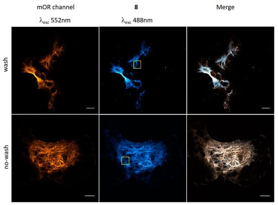 Confocal microscopy images of VimLys-BCN-mOrange expressing COS-7 cells labeled with 8 (washed and no-washed schemes). Scale bar: 10 µm. Yellow squares indicate the magnified area presented in Figure 3.