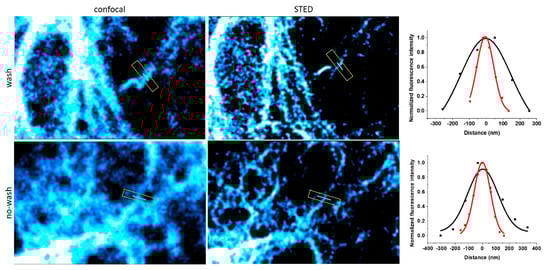 The spectral properties of 8 suggest that the probe is suitable for super-resolution imaging using STED microscopy with a 660 nm depletion laser (Supplementary Material, Figure S2). Therefore, we have subjected the samples to super-resolution imaging using STED microscopy (Figure 3) and concluded that probe 8 is indeed suitable for STED microscopy. Again, we did not experience considerable change in the resolution between washed and non-washed samples. It should also be noted that no loss of signal-to-noise ratio was observed up to four cycles of STED imaging with ~64% STED intensity. Further cycles, however, resulted in gradually fading images due to bleaching of the probe (Figure S5).