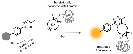 Representation of bioorthogonal labeling schemes involving tetrazine quenched fluorogenic probes and genetically bioorthogonalized proteins.