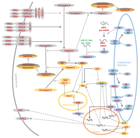 The action of IRE1α is characterized by both kinase and endo-RNAse activity [13]. The presence of unfolded proteins liberates IRE1α from the BiP complex. The release of IRE1α into an unbound state allows it to form oligomers, and its cytosolic domains are autophosphorylated, causing its activation. Activated IRE1α excises the regulatory intron from the X-box binding protein-1 (XBP-1) mRNA, which enables its translation [37]. XBP-1 degrades miRNAs-17, -34a, -96, -125b, which are repressors of caspase-2 translation. Therefore, XBP-1 translation leads to an increase in caspase-2, which, like caspase-8, converts Bid into tBid, eventually activating the mitochondrial pathway of apoptosis [38].