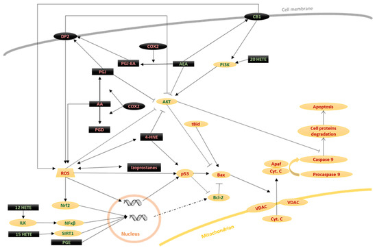 In pulmonary epithelial cells, 20-HETE acts by activation of NADPH oxidase, slightly increasing the level of ROS that, surprisingly, exerts an antiapoptotic effect. Thus, it has been suggested that the use of anti-oxidants might abolish the protective effect of 20-HETE on cells. Indeed, a slight increase in the level of ROS causes activation of cytoprotective pathways (including those associated with Nrf2), without causing oxidative damage to the cells, which would lead to the activation of proapoptotic pathways [105]. Although the exact mechanisms of prostaglandin action in vivo have not been determined, PGDs are known to reduce tumor cell survival, while animal studies have shown that mice null for lipocalin-type prostaglandin D synthase (L-PGDS-/-) have significantly reduced levels of tumor cell apoptosis [106]. However, it has yet to be elucidated which apoptosis pathways are involved in this process.