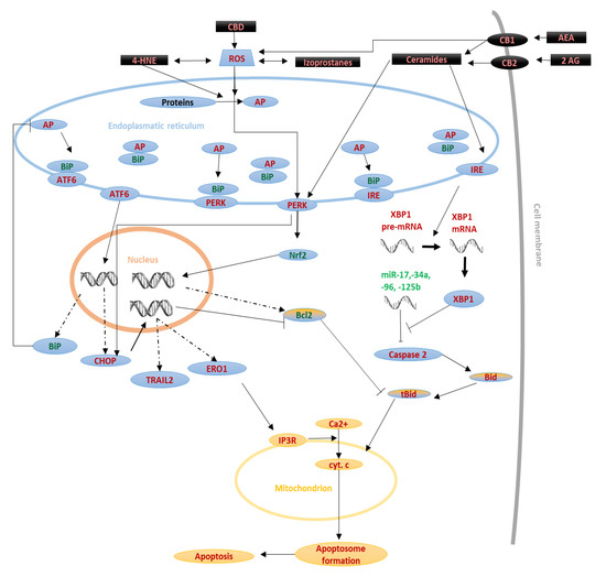 Endocannabinoids could also participate in apoptosis by inducing autophagy and ER stress, as the consequence of activation of cannabinoid receptors is an increase in ceramide production, which can lead to ER stress. This confirms the principle of ER stress markers, such as PERK phosphorylation, that increase in IRE1 activity and ATF6 translocation to the cell nucleus after the administration of endocannabinoids [47,114,115].