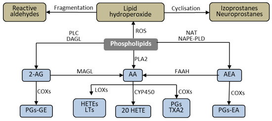 As a result of the metabolism of phospholipids by enzymes from the phospholipase family, a group of lipid mediators—endocannabinoids are generated. These endocannabinoids are comprised of ester, and amide derivatives of long-chain PUFAs, especially arachidonic acid. The most numerous group of endocannabinoids consists of ethanolamides of fatty acids, including anandamide (AEA), which are synthesized from phospholipids located in the outer layer of the cell membrane (phosphatidylethanolamine and phosphatidylcholine). Derivatives of glycerol and fatty acids are another group of endocannabinoids, of which 2-arachidonoylglycerol (2AG) is the best known. The biological activity of endocannabinoids occurs mainly through the activation of G protein-related receptors, including CB1/2 cannabinoid receptors [107].